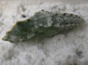 This little fella is clinging to our suburban pebble-dash. She was released from a substandard caterpillar home and just went vertical at the nearest opportunity. She has now turned brown which I hope means that she will soon be emerging as some kind of beautiful moth or butterfly and not in fact going mouldy….
