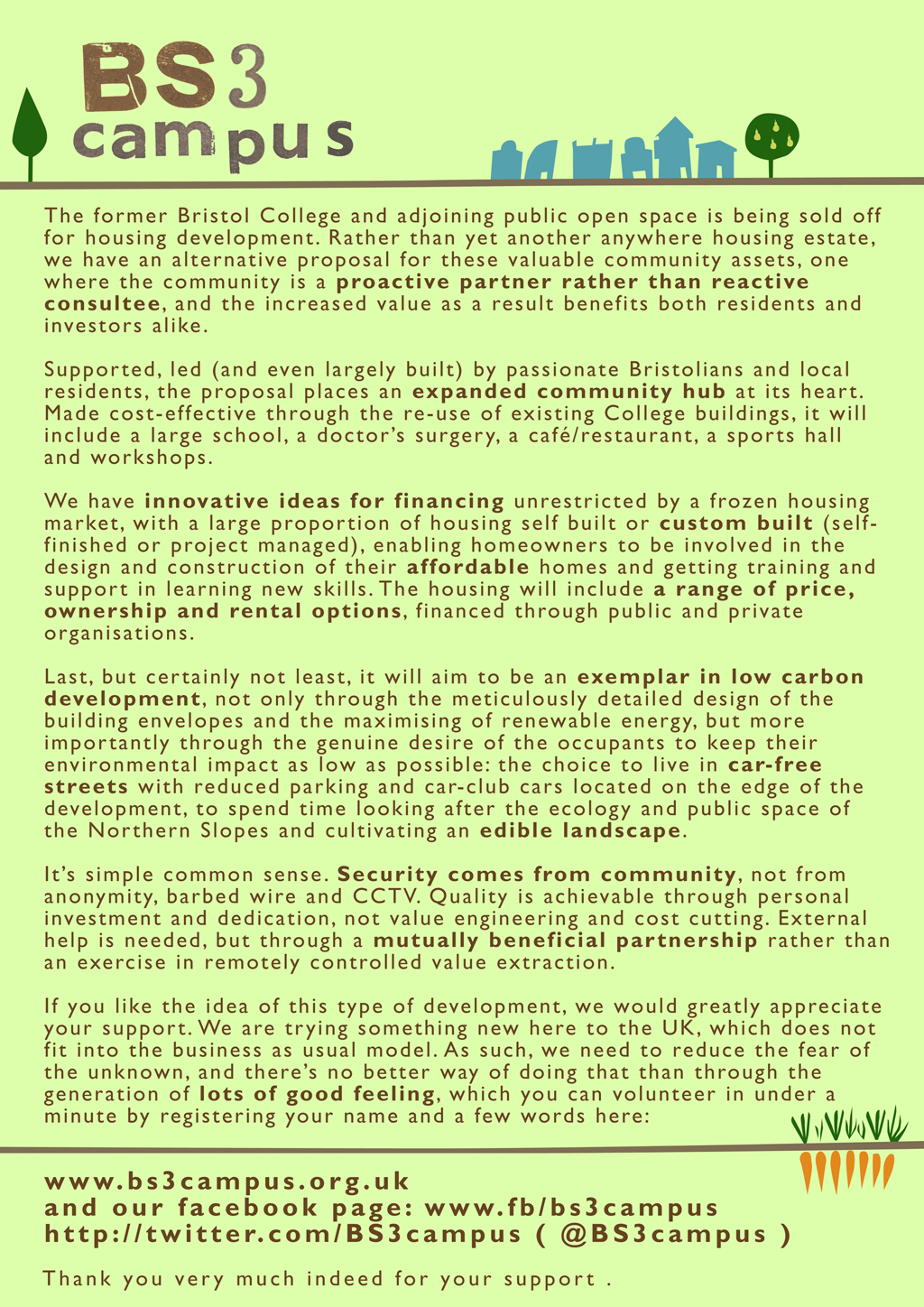 I designed this e-flyer which will soon be swooping into in-boxes all over Bristol and beyond – for the exciting BS3Campus team. The plot at the site of the old City of Bristol College in Bedminster is massive – it has beautiful views and could be an amazing place to live, as well as providing great resources for the wider community nearby. They need support to prevent the site from being sold to a pile ’em high developer who has not got the community’s interests at heart. Visit the site http://bs3campus.org.uk or follow them on facebook www.fb/bs3campus/twitter http://twitter.com/BS3campus ( @BS3campus )