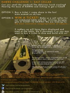 Roots Architecture Workshop is the brainchild of Tangentfield – Sally Daniels, Marcus Toop and Oliver Lowenstein of Fourth Door Review. It involves much sweat and reclaimed wood, a huge amount of enthusiasm and an array of super interesting and skilled folk all working full-tilt at WOMAD to create stages and spaces. I made a couple of flyers for a couple of warm-up challenges for the event in the run-up to the actual Challenge itself. Here they are.